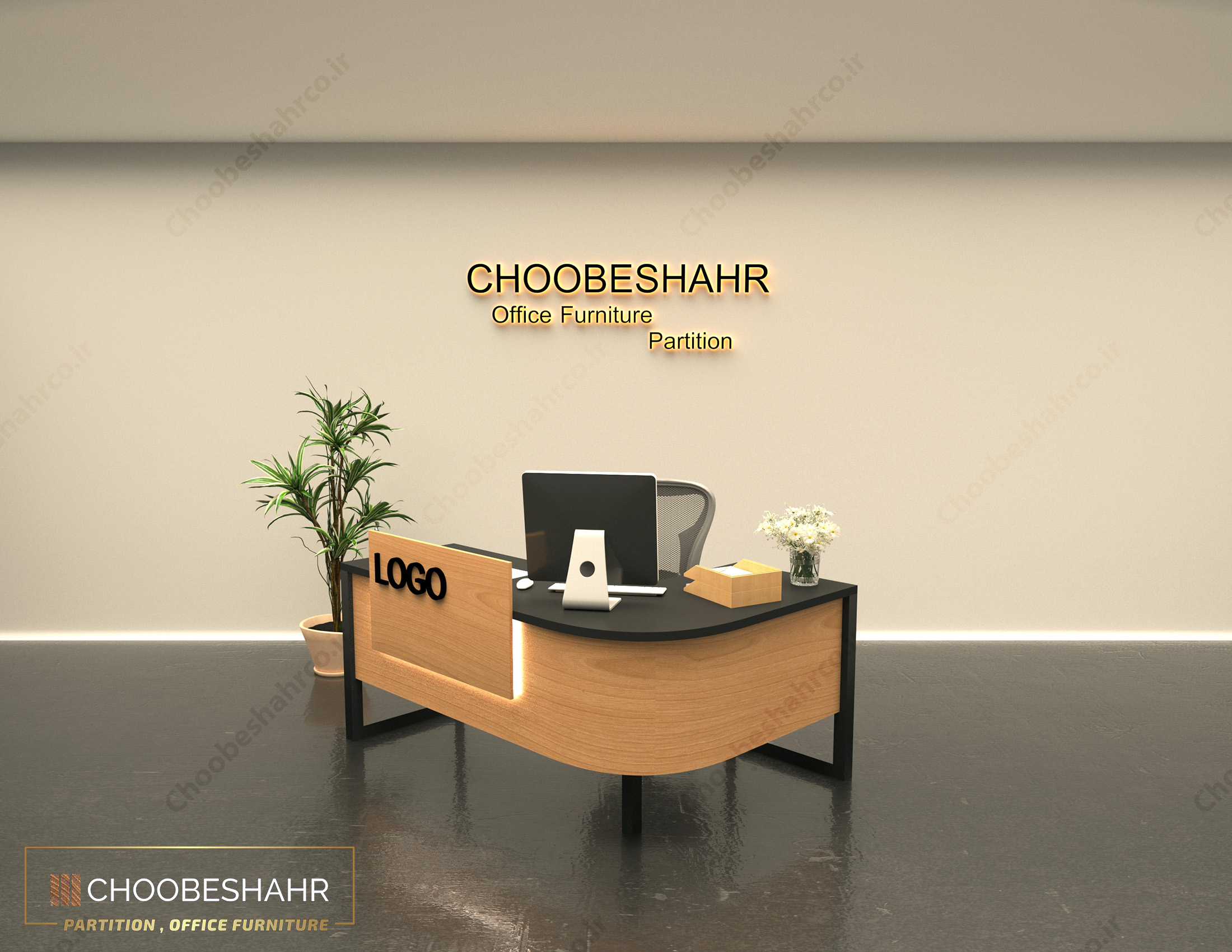 میز پذیرش مینیمال با طراحی ساده و کارآمد خود، فضای کار را به خوبی سازماندهی می‌کند. در نمای جلویی این میز، المان جداکننده‌ای وجود دارد که فضای میز تحریر را از بخش جلویی آن تفکیک می‌کند و فضایی مناسب برای نصب لوگو یا نام برند سازمان فراهم می‌آورد. علاوه بر این، نور مخفی در قسمت زیرین این تابلو، جلوه‌ای خاص به میز می‌بخشد و توجه مخاطبان را به خود جلب می‌کند. طراحی مینیمالیستی این میز، نه تنها زیبایی را به ارمغان می‌آورد بلکه محیطی آرام و منظم را نیز برای کار فراهم می‌کند.