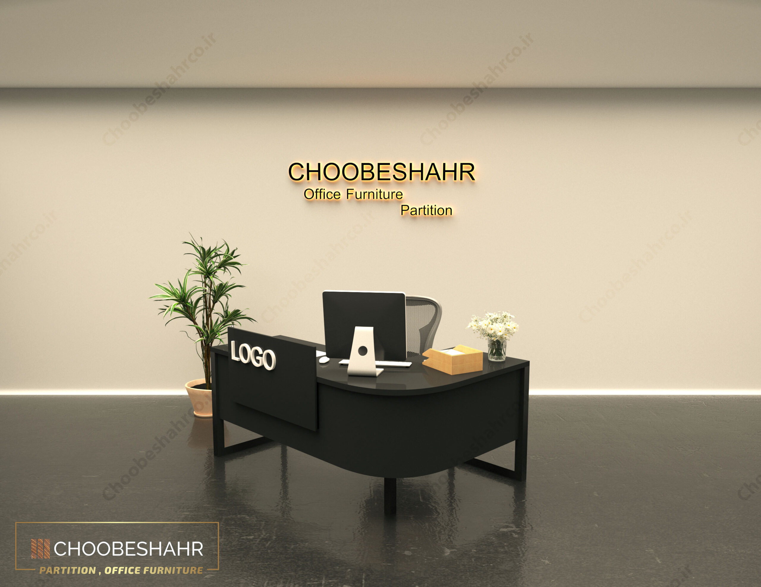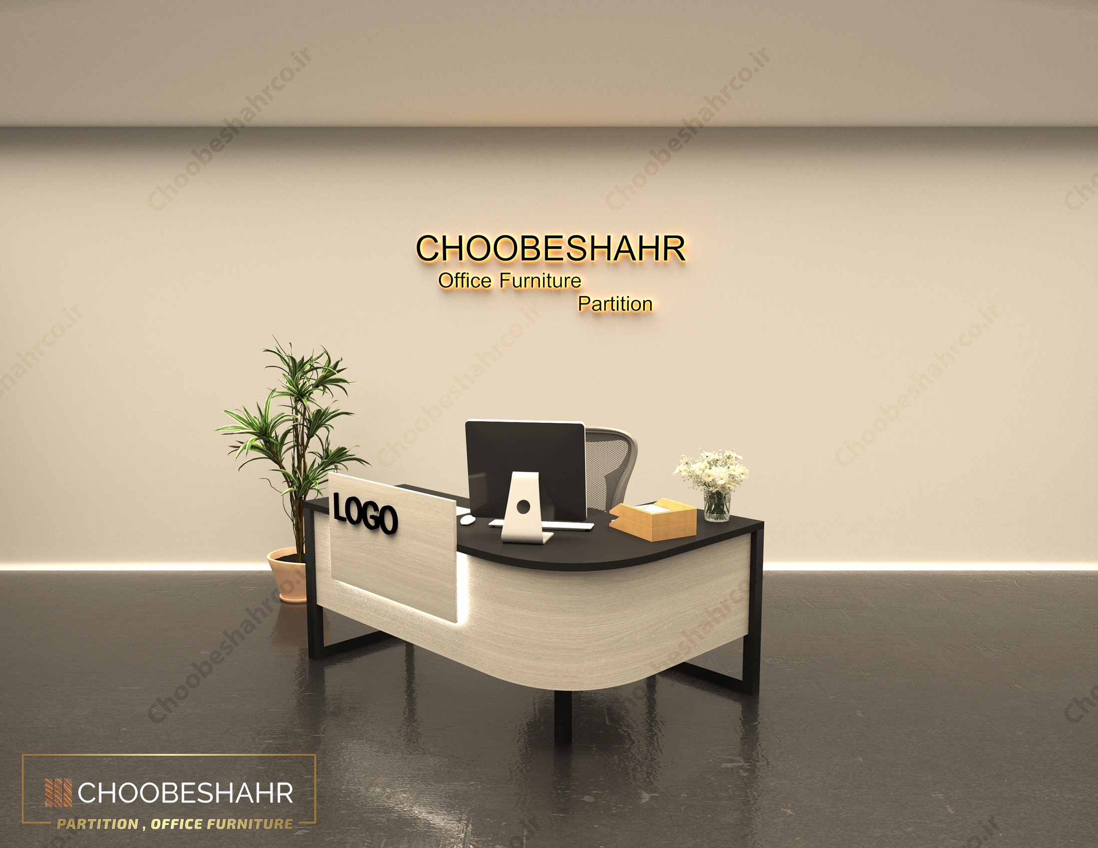 نمونه اجرا شده میز پذیرش منحنی RD-121 با رنگ بندی کرم ماشروم و مشکی مات